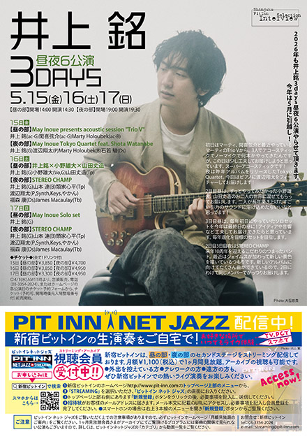 *Admission to the ‘ May Inoue 3days – 6 Performances ‘ concert will be in the order of ticket number, so if you have already made a reservation for a ticket, please be sure to purchase your reserved ticket at the Pit Inn reception desk.