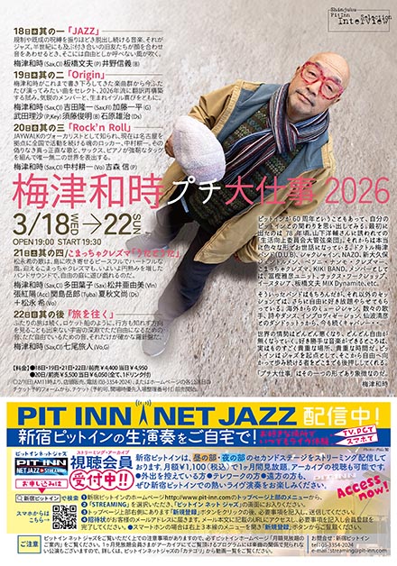 *Reservations (priority entrance at the time of opening) will be accepted from 15:00 on January 2 (fri) by phone (03-3354-2024), at the reception desk of Pit Inn Shinjuku, or through the online ticket reservation form for each performance date on our website.