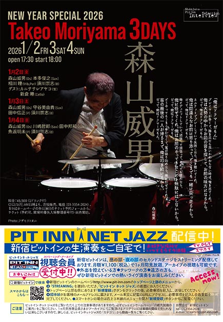 2日 森山威男(Ds)本多俊之(Sax)相川 瞳(Vib,Per)須川崇志(B)ゲスト:カニササレアヤコ(笙)新倉 瞳(Cello)